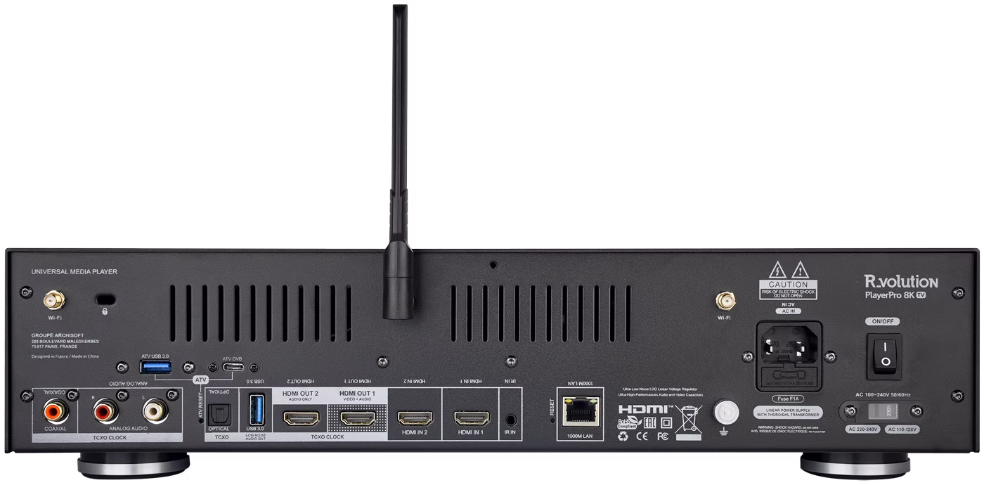 ● Linear Power Supply: The R_volution PlayerPro 8K TV media player features a linear power supply driven by a massive toroidal transformer. This design ensures a clean, noise‑free signal, resulting in superior image quality with deeper blacks, improved grain rendering, and outstanding audiovisual precision—whether you’re playing local files or using video and music streaming services.